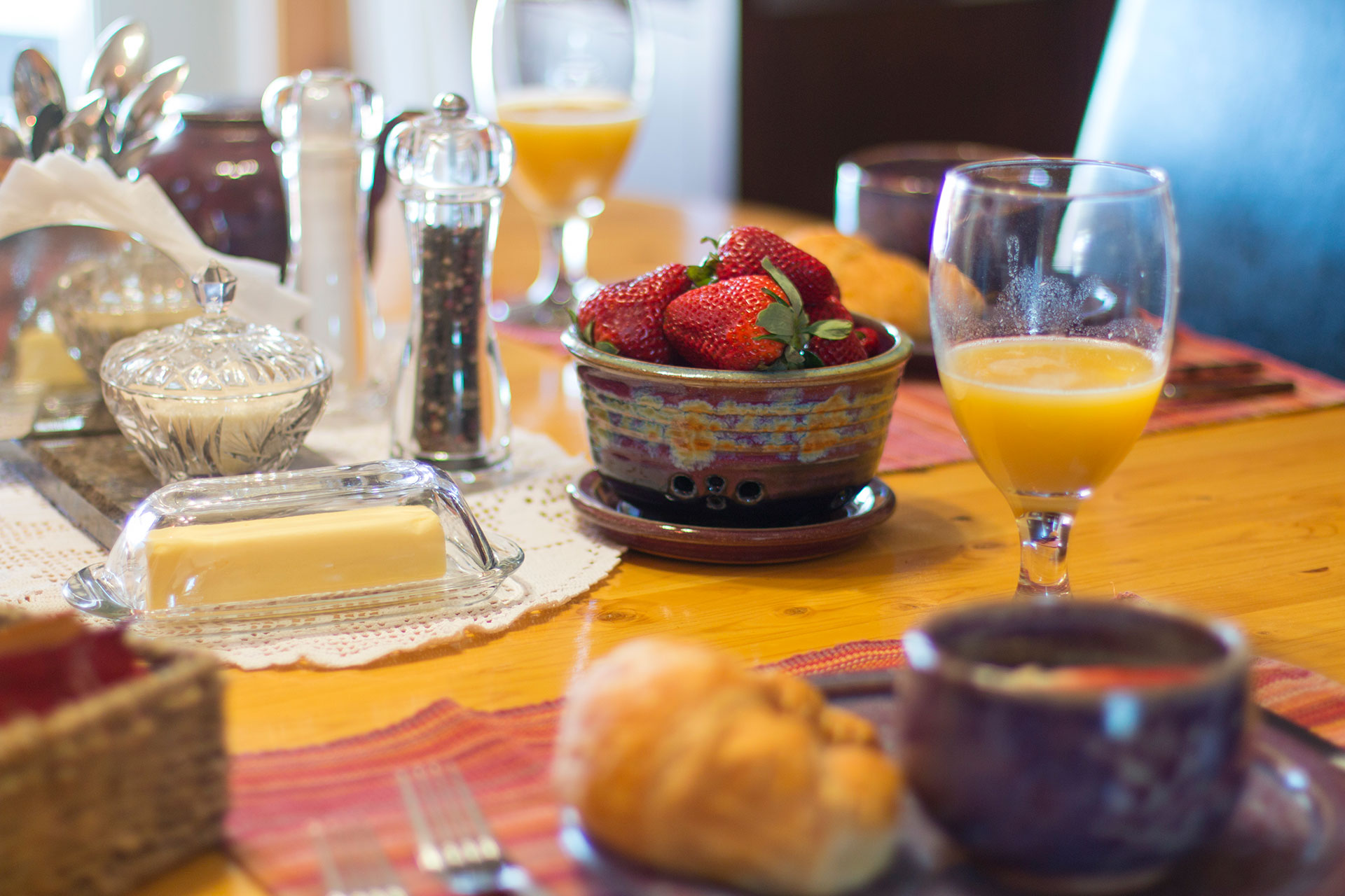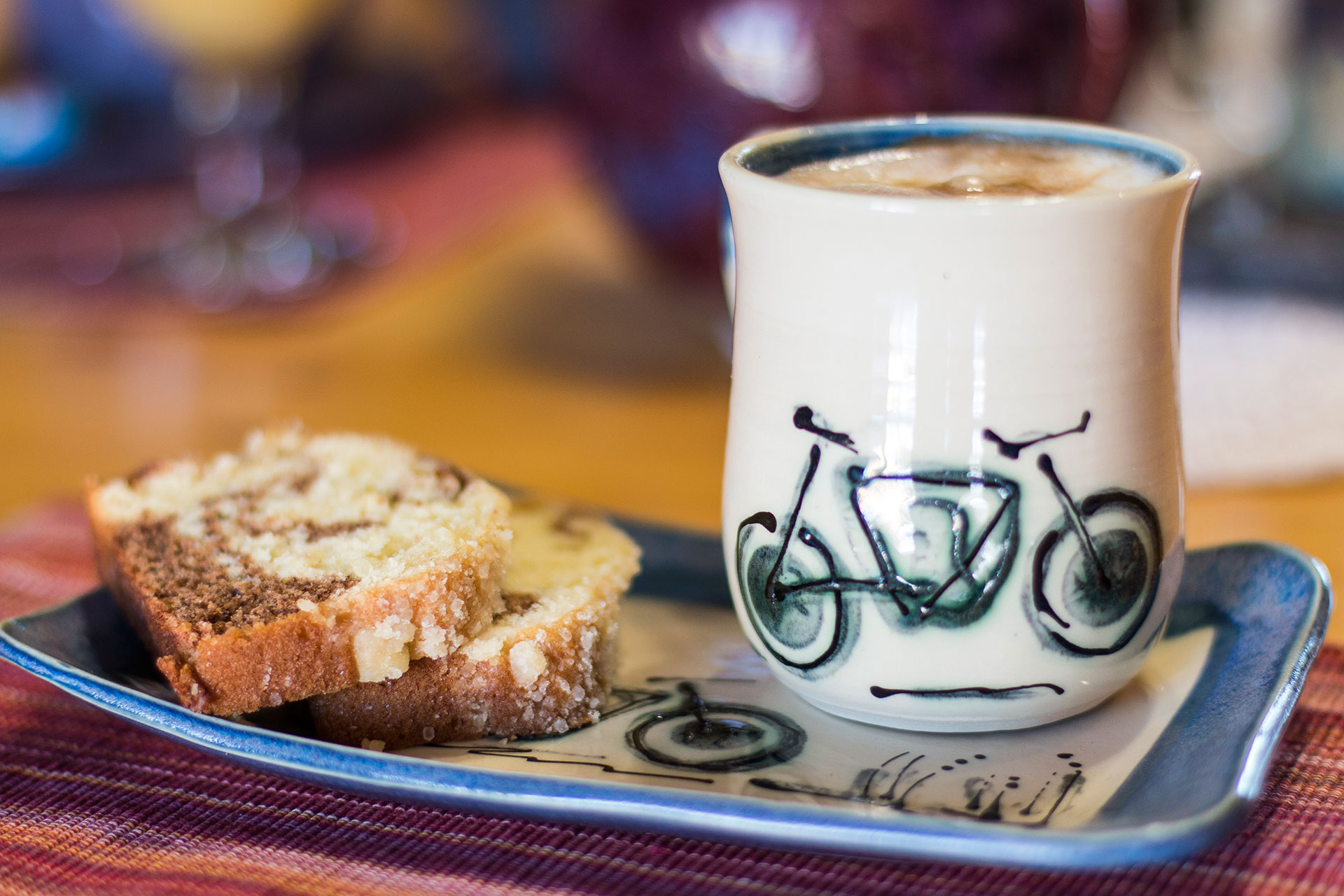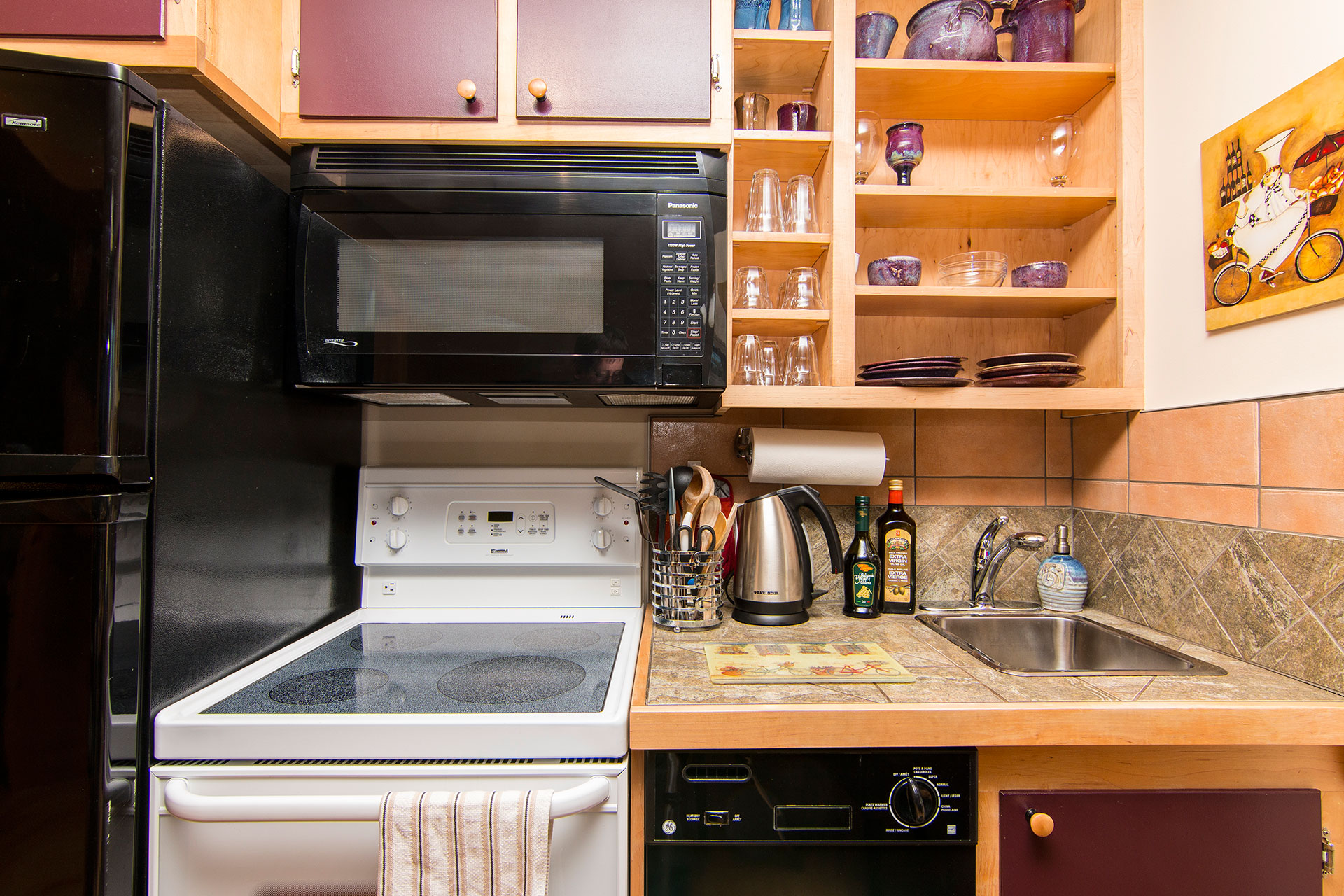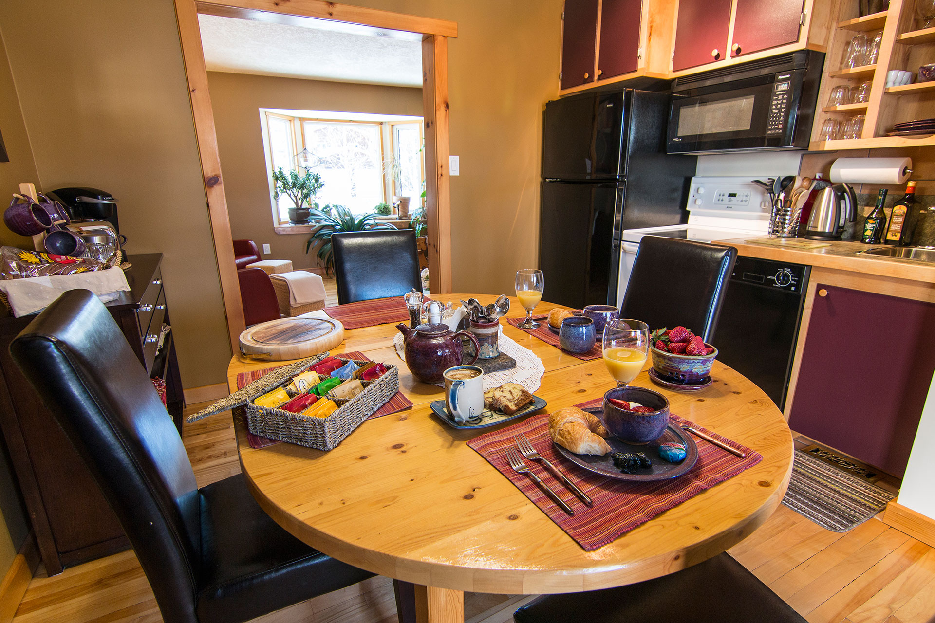 At La Bicicletta B&B, we recognize that breakfast means different things to different people. Guests have access to their own full sized kitchen and dining space. The kitchen will provide guests with basic breakfast food items and you are welcome to use and stock the kitchen for lunch and diners that you wish to prepare. There is a full sized fridge, stove, microwave, dishwasher, toaster, & Keurig coffee system. The french doors lead guests to the covered deck and BBQ. Our family lives and eats in a separate home.
